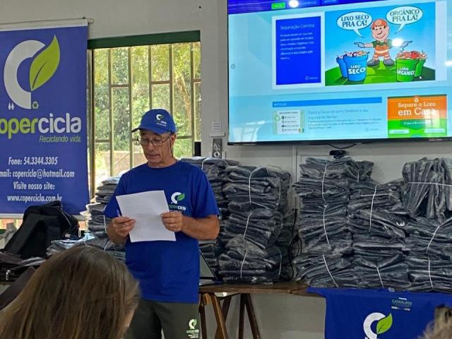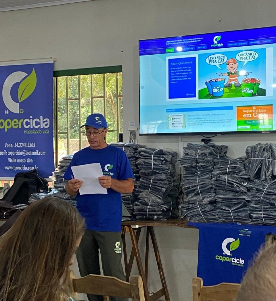 Na ocasião, também foram formalizadas assinaturas do termo de recebimento de uma retroescavadeira, cedida pela Prefeitura de Santa Cecília do Sul, e do termo de cessão de uso de um ônibus, pelo período de cinco anos. Representando a Rede Cooperação, por meio do Projeto 21.967 – Programa Cataforte, também ocorreu a entrega simbólica de novos equipamentos, equipamentos de proteção individual (EPIs) e cursos destinados à cooperativa.