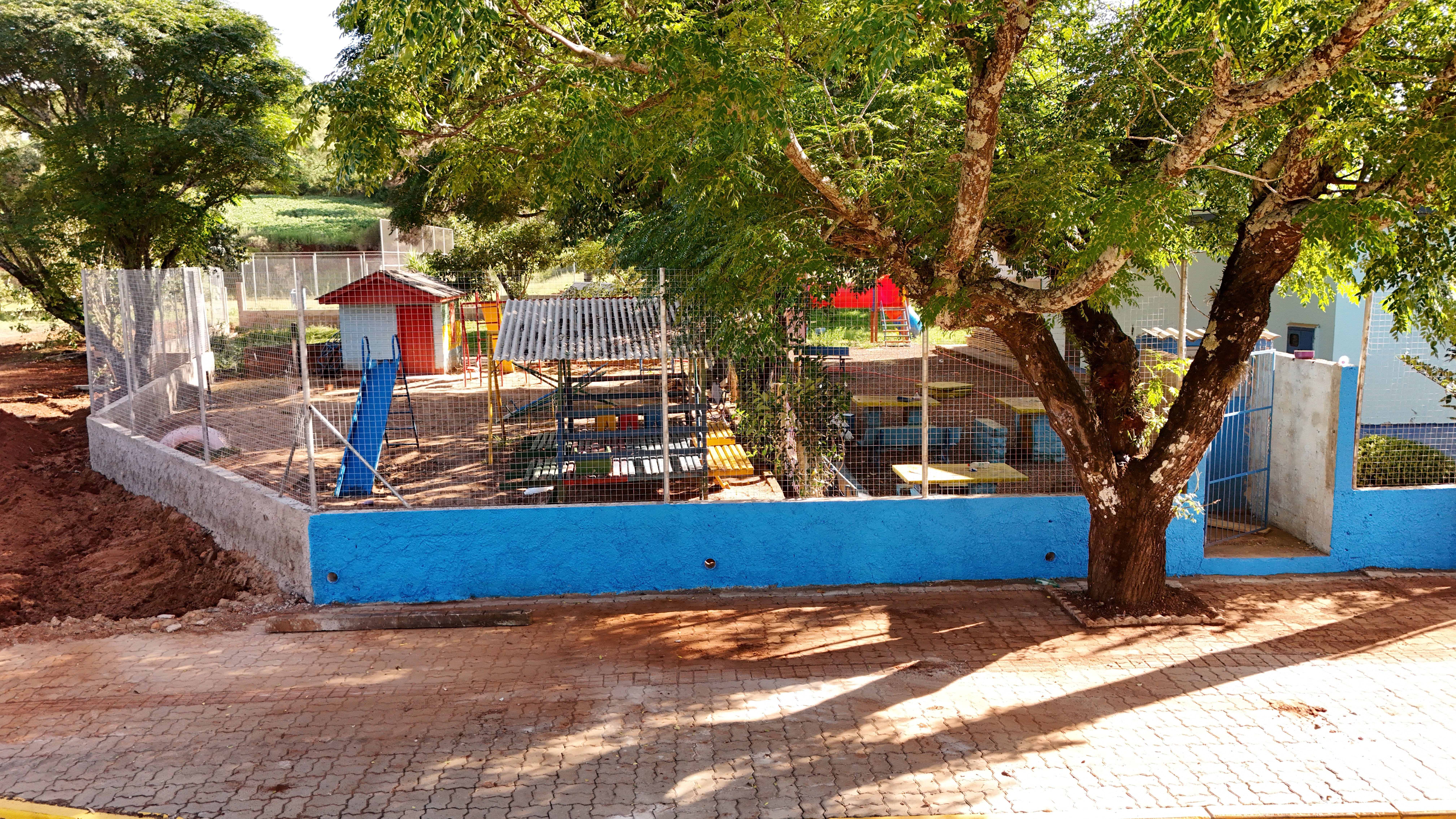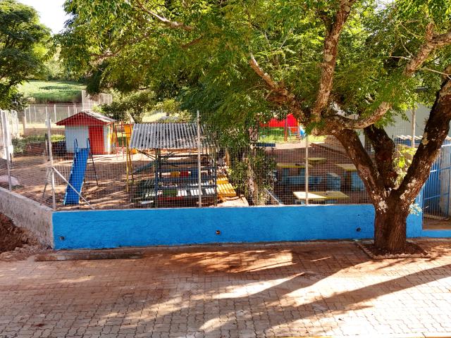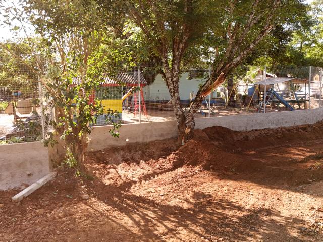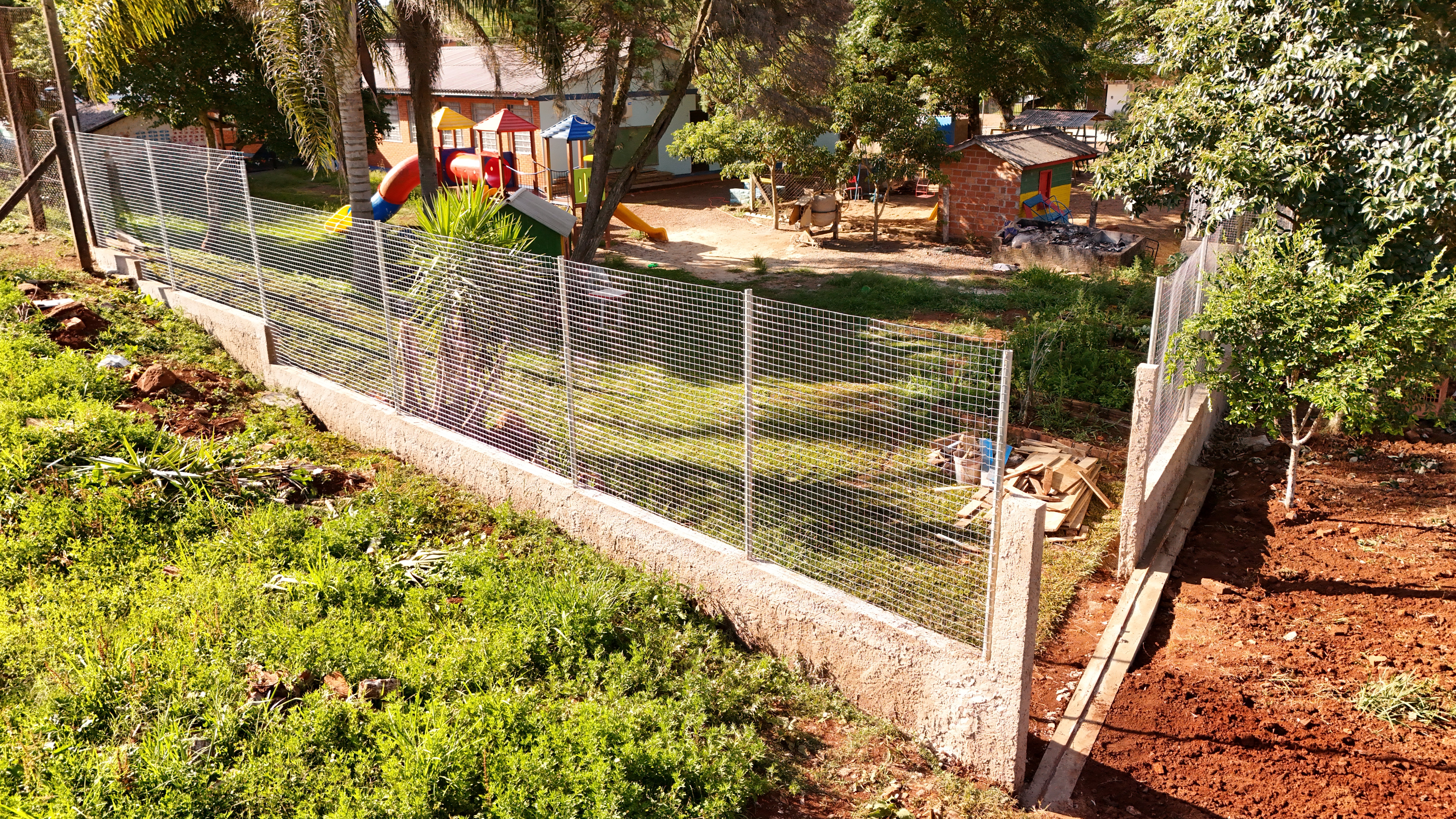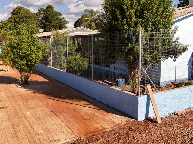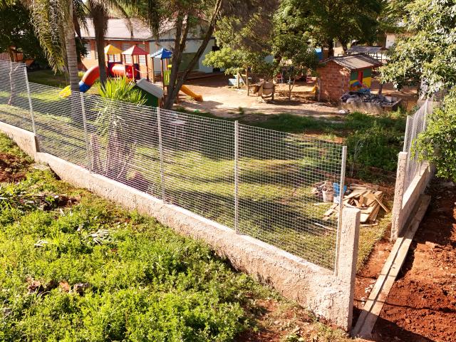 O antigo cercamento apresentava altura insuficiente e fragilidade estrutural. A melhoria realizada contempla 80 centímetros de muro em toda a extensão do terreno e dois metros de tela instalados acima dessa base, formando uma barreira mais alta e resistente, adequada às necessidades da escola.